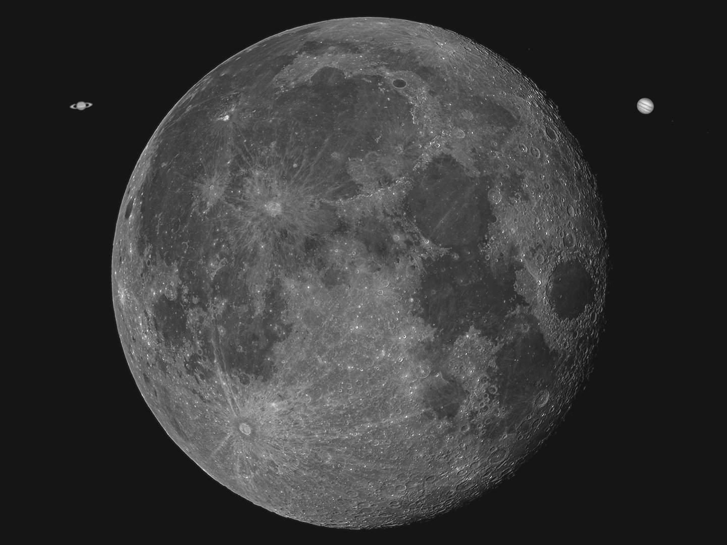 Hier soir, un peu d'astro à la sauvette, avec la Lune, Jupiter et Saturne, encore trop basses au moment de la prise, mais c’était pour le fun car à 565mm de focale faut pas rever
