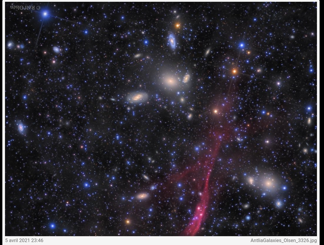 Cliquez sur l'image pour une version plus grande. Nom : AntliaGalaxies_Olsen_3326.jpg Vues : 14 Taille : 723,2 KB ID : 4277 … et pour ceux qui aiment beaucoup d'informations, voici une version annotée de la même photo ! Cet astrophotographe, Rolf Olsen, a fait un travail incroyable !