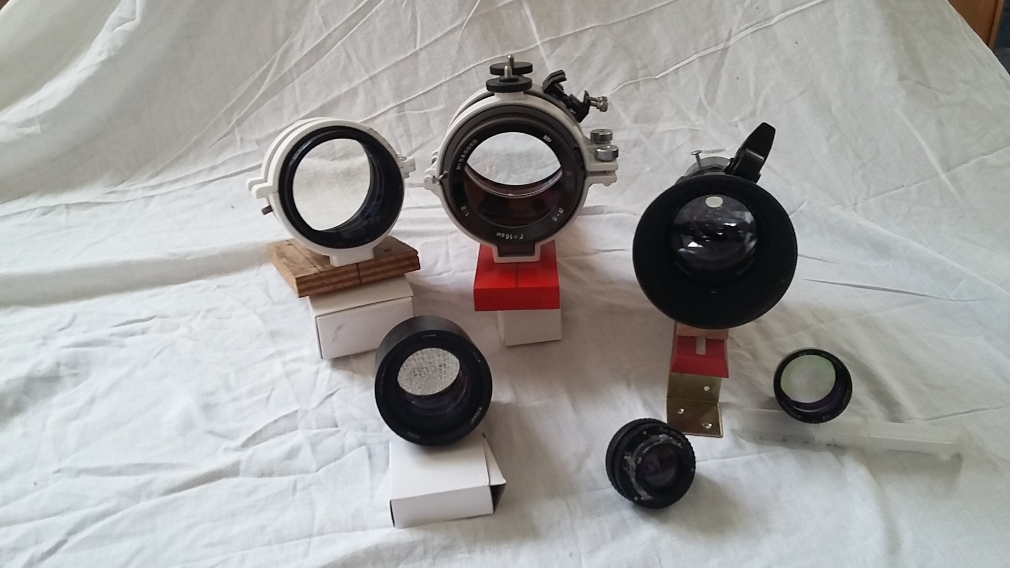 Des optiques de projecteur de cinema venu de pays ou il pleut du plomb , des optiques d'avions espions, de cabinet de radiologie, de caméras vidéos , de rétroprojecteur bref rien de destiné a l'astronomie.