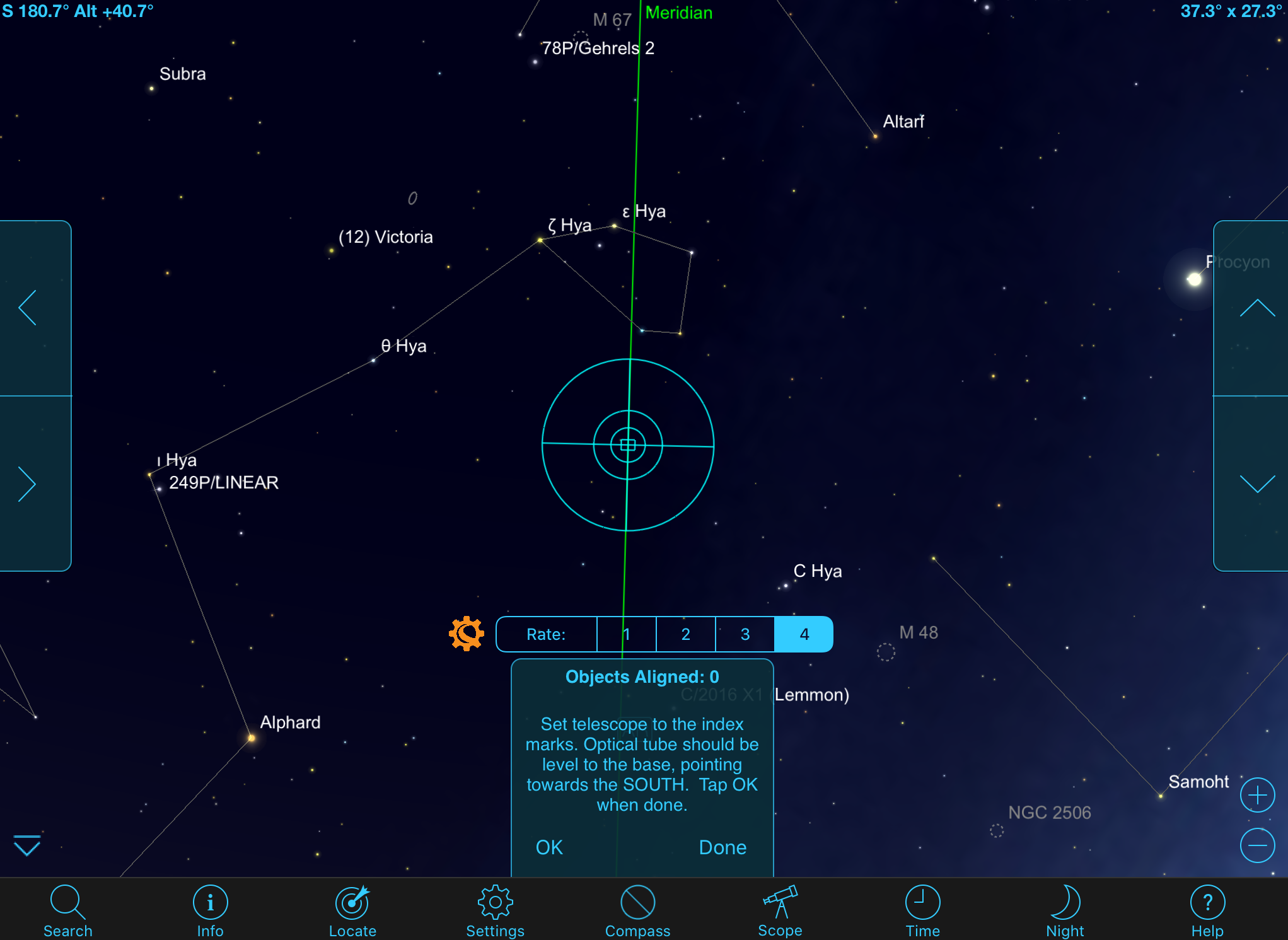 Le compteur "Objets Aligned:" va s'incrémenté jusqu'à la valeur 4. A cette étape, une erreur (volontairement énorme pour l'exemple) en altitude N°et Azimuth E° va avoir été calculée.
