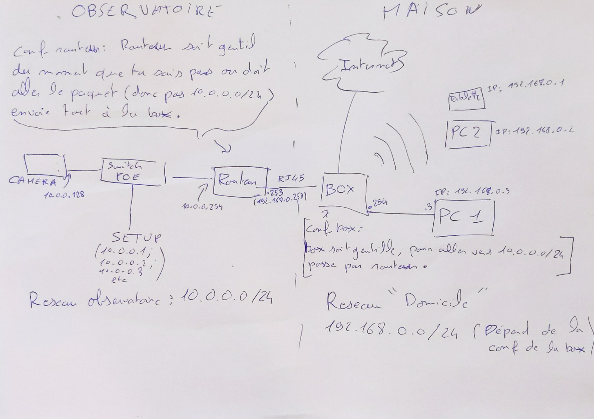 hmm ça doit être possible mais comment tu te connectes à internet alors ? c'est quand même nécessaire pour certains trucs de se connecter pendant les séances non ?mickyman23 a écrit : ↑12 nov. 2022, 09:44Je viens de faire comme toi.John Mc Burn a écrit : ↑12 nov. 2022, 02:32En tous cas, dans l'observatoire, on a bien les 2 cameras en poe branchées chacune avec leur cable rj45 vers les switchs de l'armoire elec de l'observatoire, cette dernière est reliée en rj45 a la box qui est a la maison, et mon pc de bureau est branché sur ma box, donc oui, c'est comme sur ton deuxieme shema, ce qui est logique.