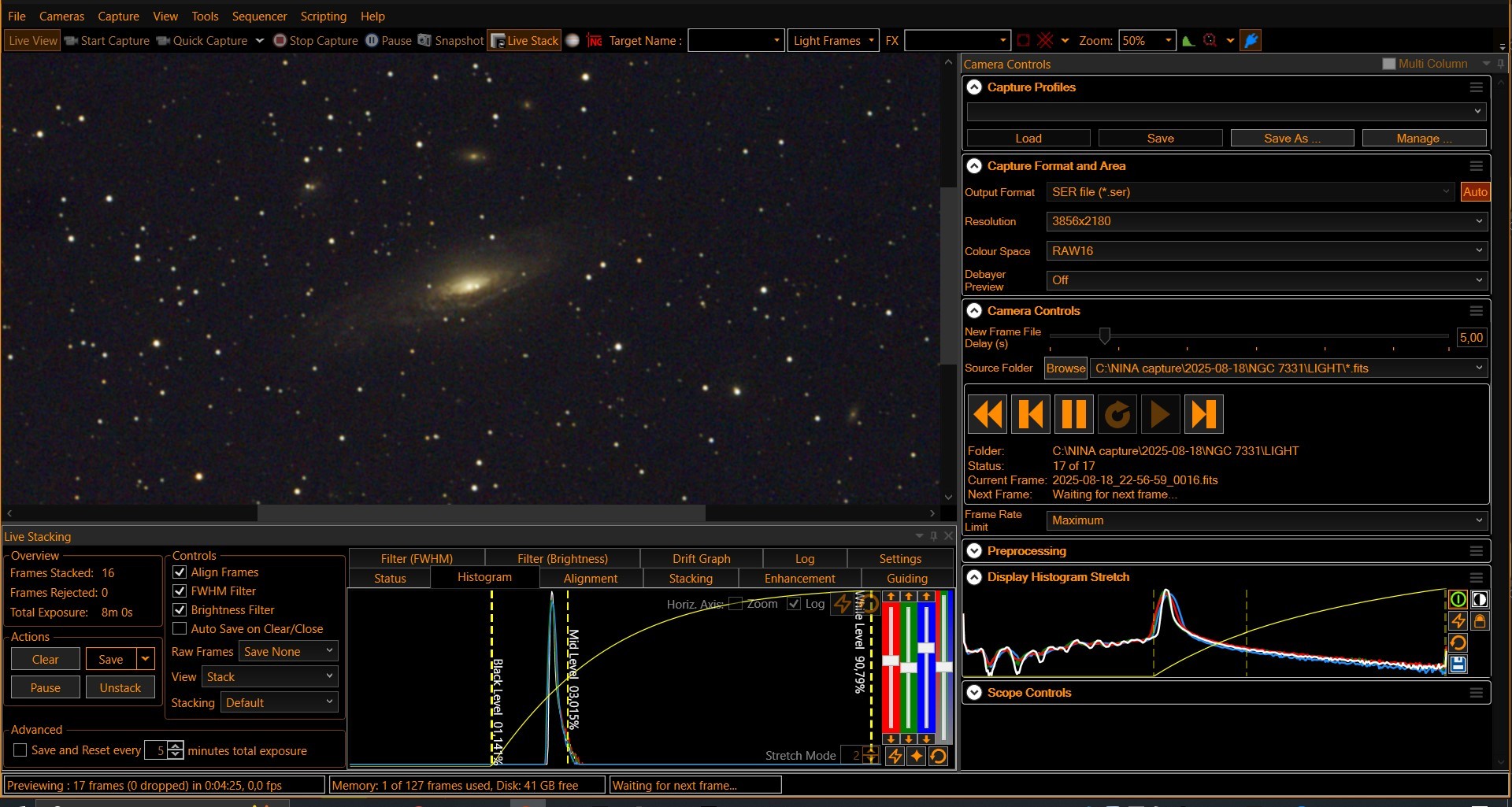 Le live stacking de Nina, c’est plutôt limité, mais ça permet de suivre un peu ce qu'on fait. Par contre, il prend pas les images déjà dans le dossier, il ne stacke qu’avec les nouvelles qui arrivent.