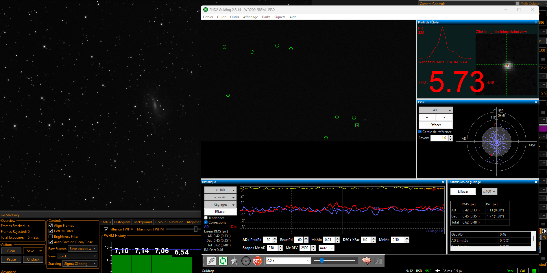 Le seeing est vraiment bon ce soir, si bas et pourtant phd2 reste sous 0.70rms... ou est ce parce que j'ai mis juste 5kg de contrepoids au lieu des 10 ? ou les 2