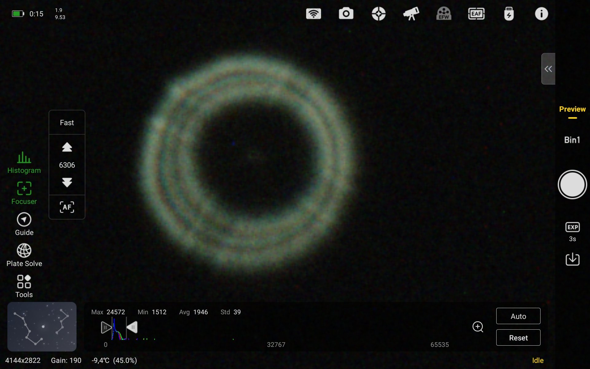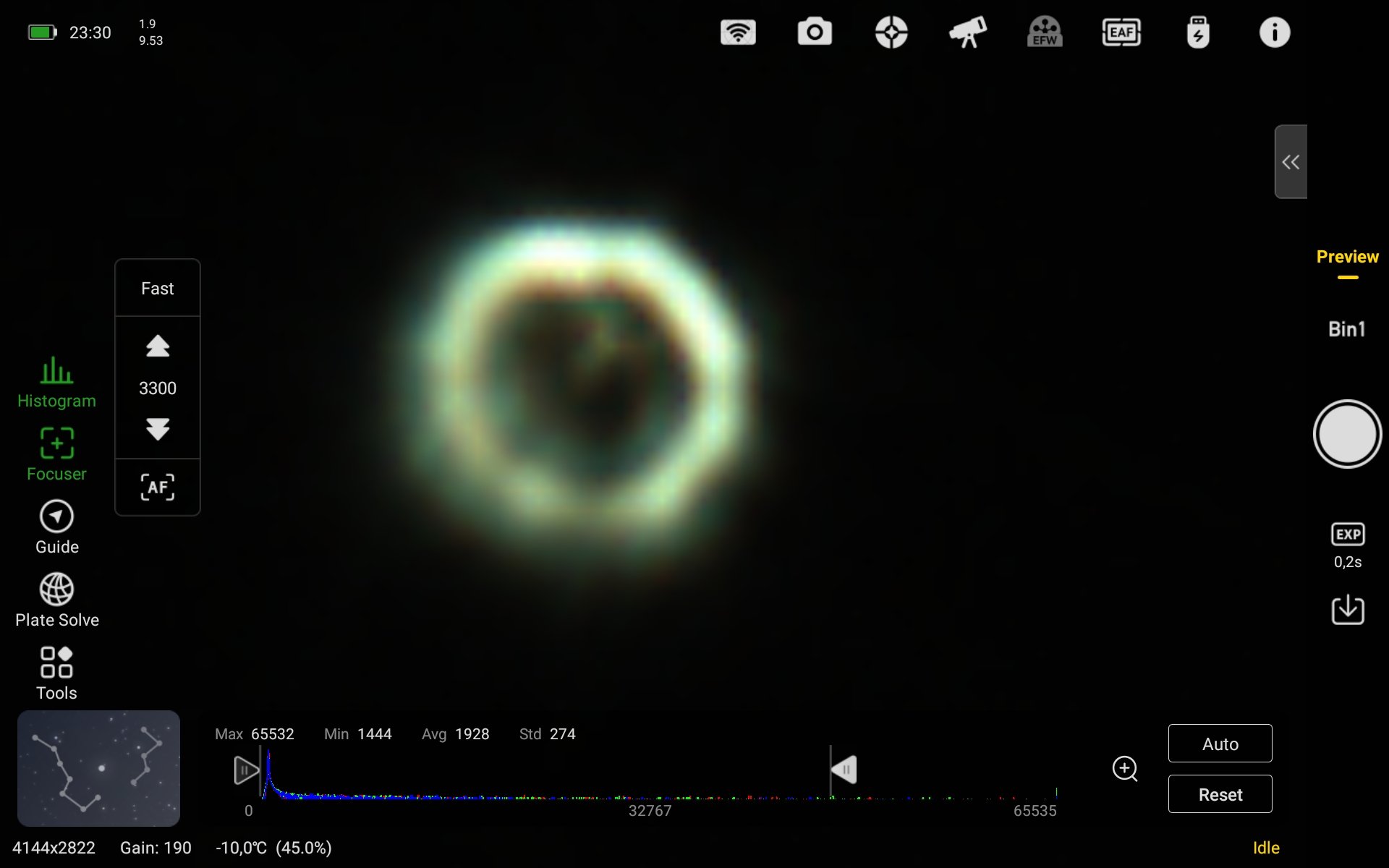 En tout cas, cette fois on a bien une image très défocalisée et un champ étoilé gain à donf et poses d'1s. Un bon point.