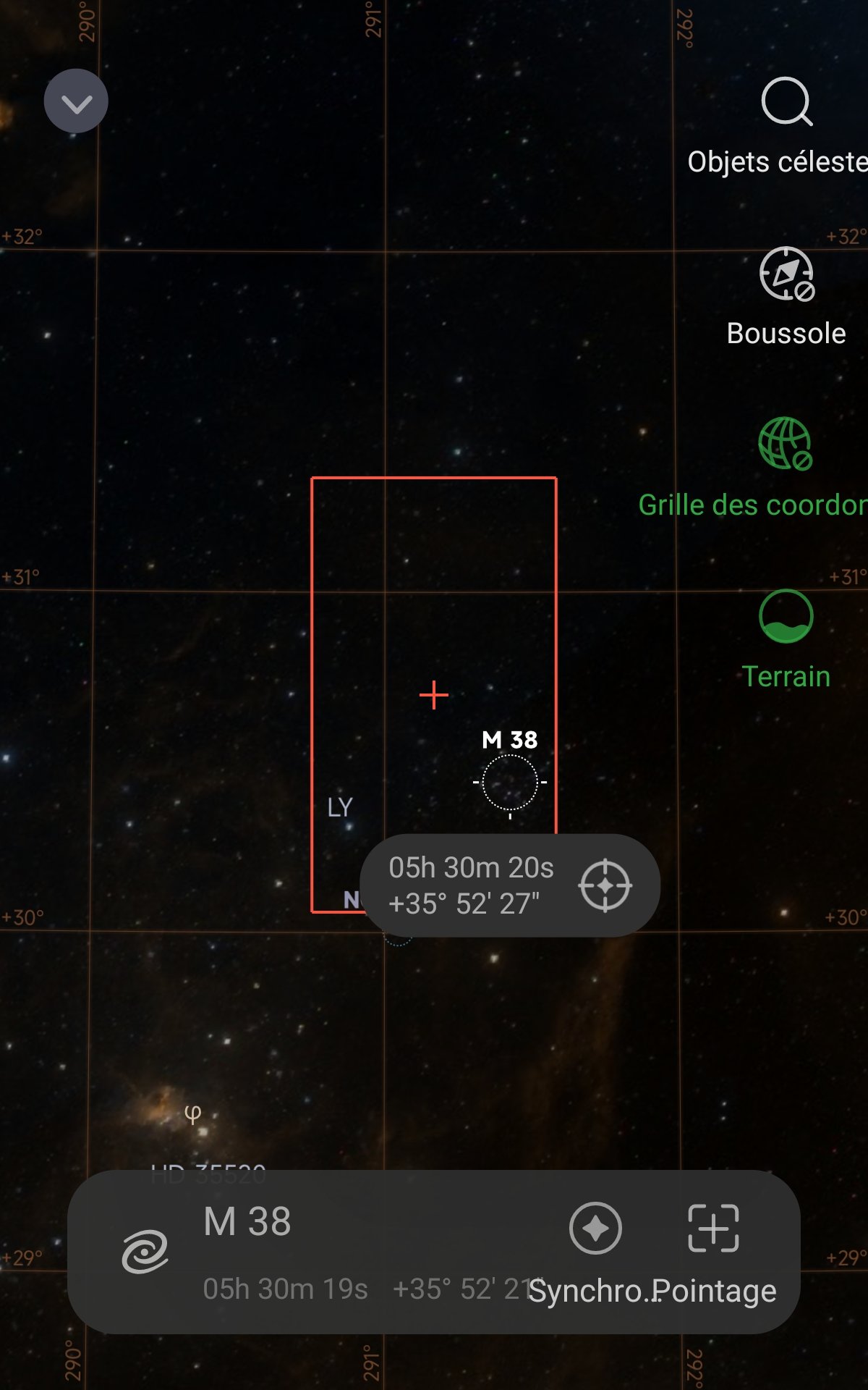 Mais je crois que c'est possible de se débrouiller avec des coordonnées en utilisant l'atlas du ciel du Seestar (étant connecté au Seestar). On pointe d'abord sur un objet connu du Seestar (Messier, NGC,IC, LDN) proche de la zone cible . Puis on déplace la carte pour que le cadre rouge vise une nouvelle zone et... bonheur