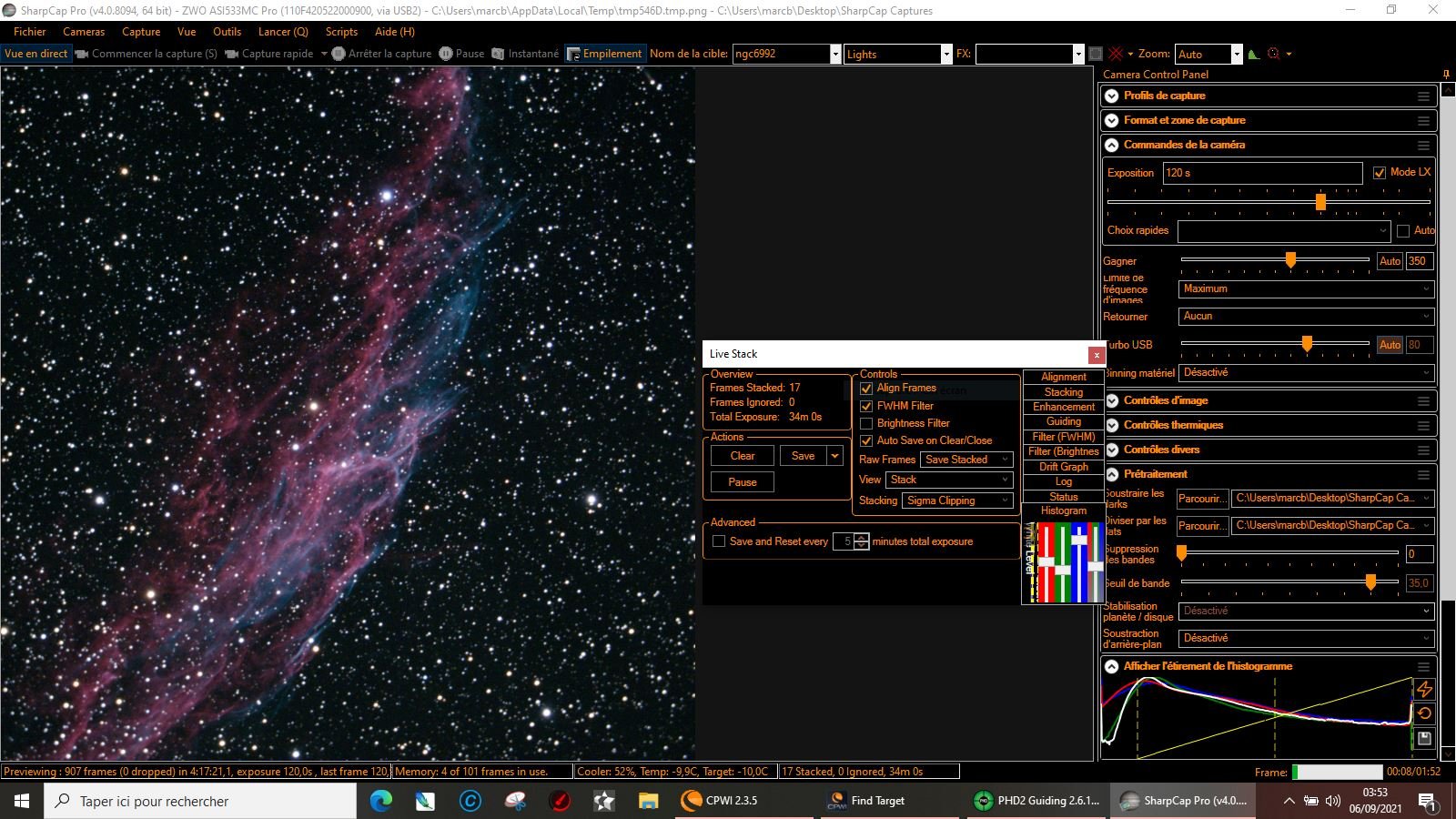 Je commence avec Pac Man, ngc281 en poses de 120s (et ouais avec du poids à l'est cela passe) le savescreen à 15 x120s Dans l'euphorie, j'ai omis de faire les saves en fin de stack, je repasserai voir pac ce soir et vous mettrai le résultat dans le vastrophoto.