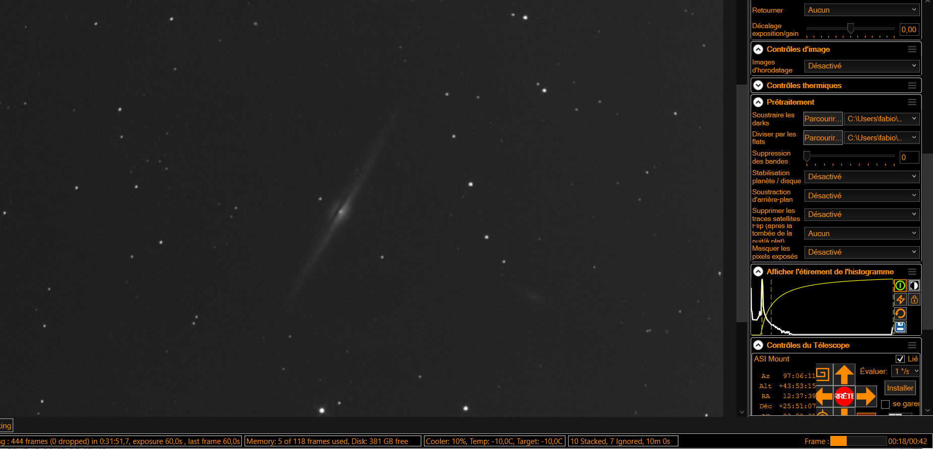 NGC4565 FILTRE LPRO CAMERA 533 POSE DE 1MN GAIN 125 OFFSET 35 pour 10MN ça sera la seule cible après dodo boulot a 4H00