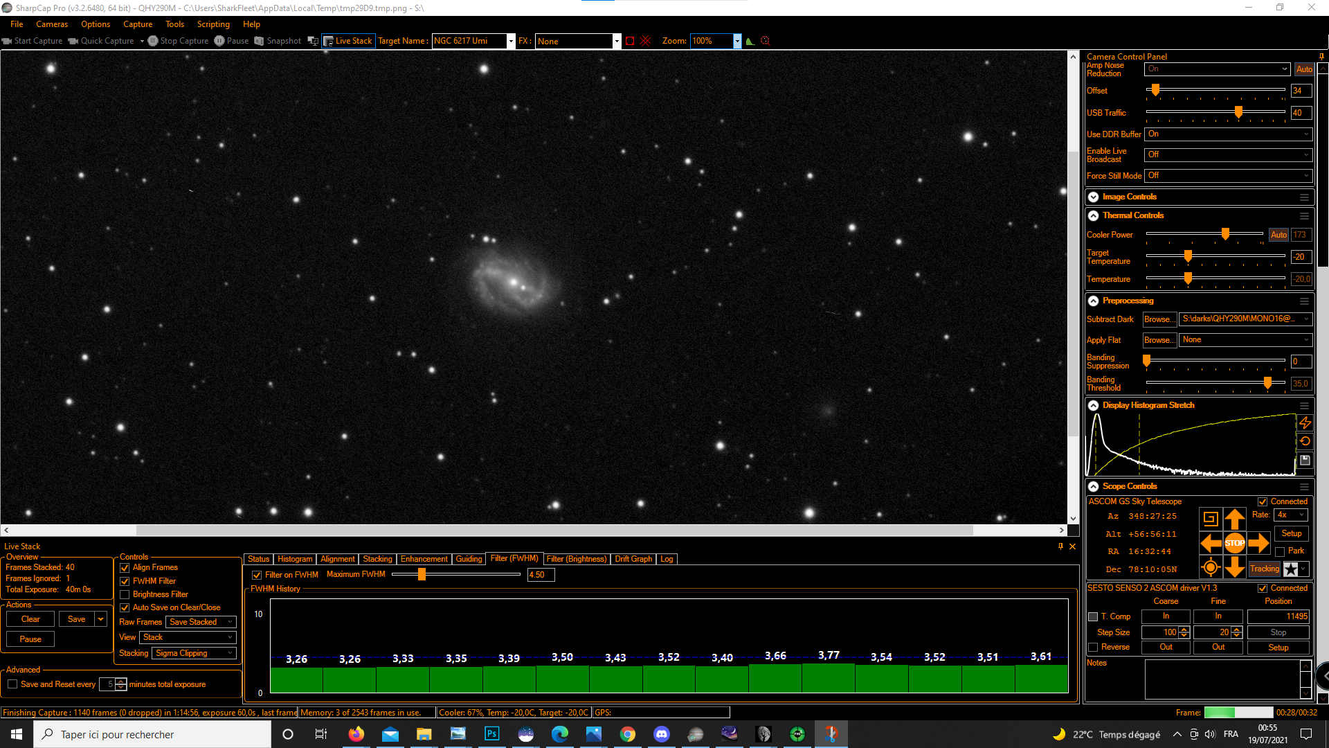 Pour être dans les clous par rapport a mon echantillonnage, je dois être a 2.5" d'arc de fwhm, soit 3 pixels dans SC(3x0.83=2.49), ce soir c'est dans les clous.