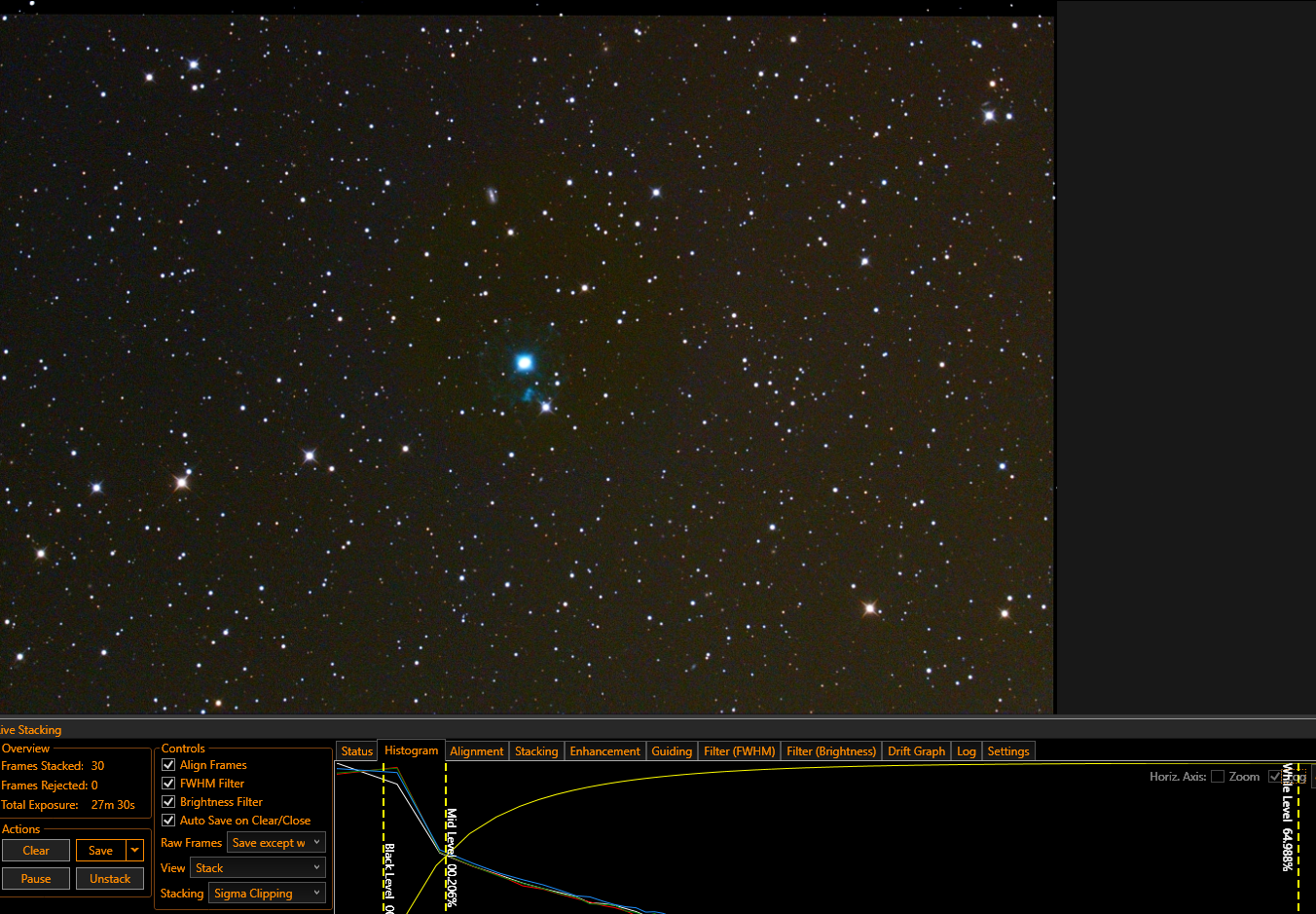 note: tu peux aussi choisir de travailler au gain unitaire et de conserver des temps de pose raisonable ( chose que je faisait avec ma 533) , la bosse de ton histogramme restera complétement écrasée sur la gauche , et le signal "utile" sera noyé dans le bruit de lecture ton capteur . Mais nos capteurs modernes ayants un bruit de lecture très faible on reussi quand même a obtenir de bons résultats surtout si on souhaite rester en mode VA ( ie: des temps de pose raisonable ). L'autre inconvenient c'est un equilbrage des couleurs un peu plus complexe, il faut attendre que SC empile suffisament de poses avant d'ajuster les courbes RVB.