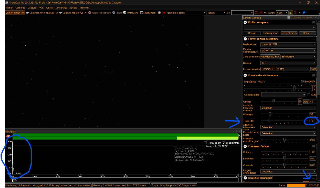 j'avais aussi oublié de saisir le dark correspond, alors là sans comprends si j'utilise un dark SHO ou Luminance la courbe est beaucoup trop à gauche et impossible de l'étirer quelques Etoiles c'est tout curieux, pourtant dark pris à -10, gain 80 offset 25 ou 50 suivant le cas
